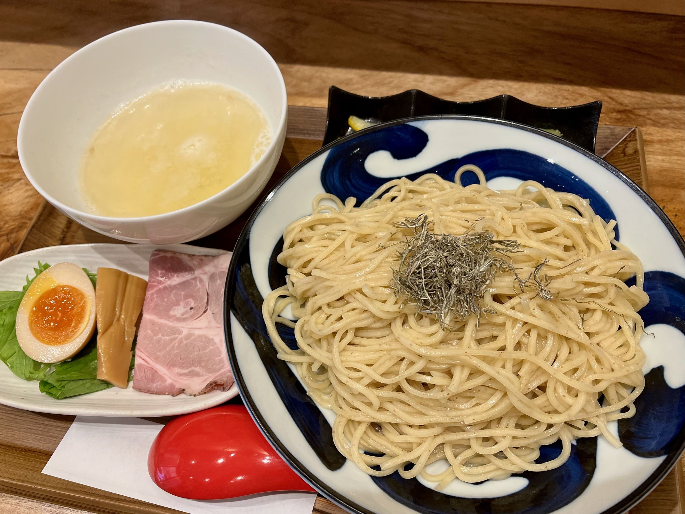 「特製つけめん」(950円)も人気。昆布のうま味をじっくりと抽出した昆布水をつけダレ代わりにしており、やさしくもあっさりとした味わいで楽しめます。全粒粉を使った中太麺は1.5玉相当の210グラムで、大盛り(280グラム)も同じ価格で選べます。提供時には、わさび・レモン生姜・柚子ピールを添えており、好みの香りに合わせて味を変えながら食べ進められるのが特徴です。