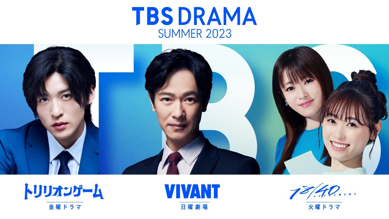 日曜劇場『VIVANT』、火曜ドラマ『18/40~ふたりなら夢も恋も~』、金曜ドラマ『トリリオンゲーム』の主演4人の写真を使ったブランドビジュアル。TBSドラマで「夏の夜をドラマティックに。」