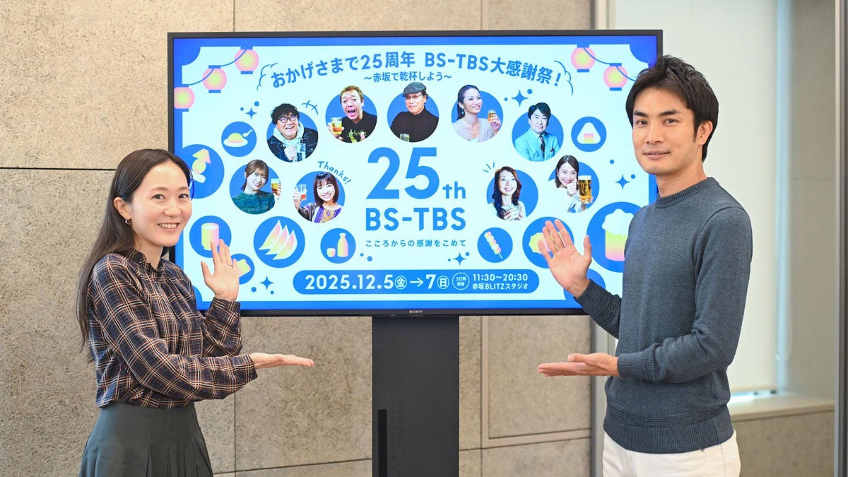 2025年12月5日(金)・6日(土)・7日(日)に、TBS赤坂BLITZスタジオにて、BS-TBSの開局25周年を記念した体験型イベント「おかげさまで25周年 BS-TBS大感謝祭! ~赤坂で乾杯しよう~」が開催されます。イベントの詳細について、BS-TBS事業部の有我健と黒木彩香に話を聞きました。