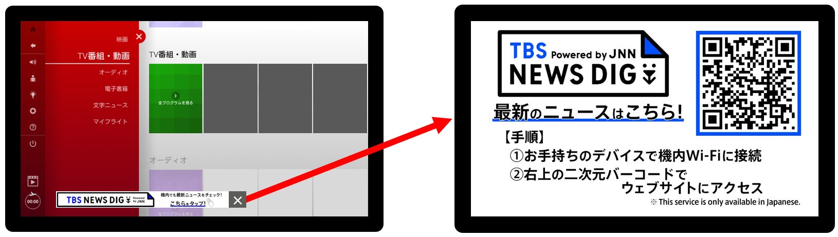 TBSテレビをキー局とするJNN28局のニュースメディア「TBS NEWS DIG Powered by JNN」(以下「TBS NEWS DIG」)は、日本航空株式会社と連携し、JAL国内線の個人用モニター上に表示された二次元バーコードをお手持ちのデバイスで読み込むことで「TBS NEWS DIG」へアクセスできるようになりました。これにより、お客さまに最新ニュースをお届けします。