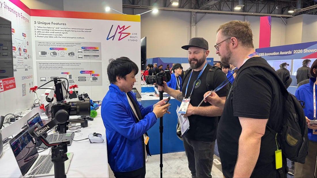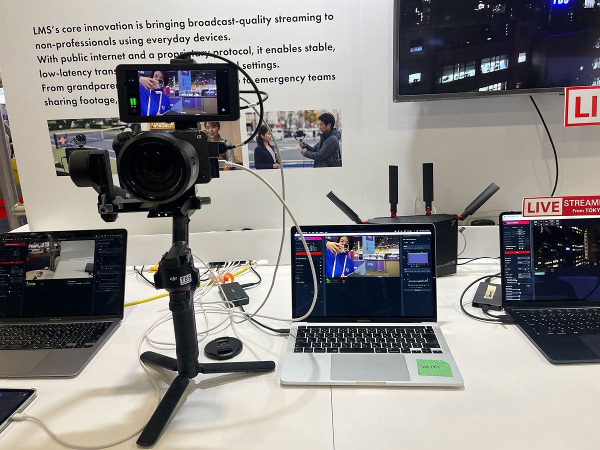 2年連続出展している「Live Multi Studio(以下、LMS)」は、映像・音声・制御信号伝送プロトコルおよび、同プロトコルを実装したソフトウェアの名称です。LMSを使った伝送は、インターネット越しでも超低遅延(機器の遠隔操作がスムーズに可能なレベル)という特徴があり、同ソフトウェアは一般的なPCやスマホ・タブレットで利用が可能で誰でも使いやすいものです。TBSテレビとWOWOWが共同開発しています。