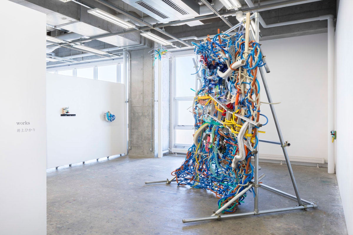 1999年、神奈川県生まれ。2024年、武蔵野美術大学大学院油絵コース修了。井上はこれまで工業製品の“ツヤ”や、それらが持つかたちに惹かれ作品を制作してきた。近年ではホースをメディウムとし、支持体と一体化させることで画面をつくり上げている。自分が選択した材料が「ここに存在している」ことを重視している。主な展示に「群馬青年ビエンナーレ2025」(2025年)、「ATAMI ART GRANT」(2024年)など