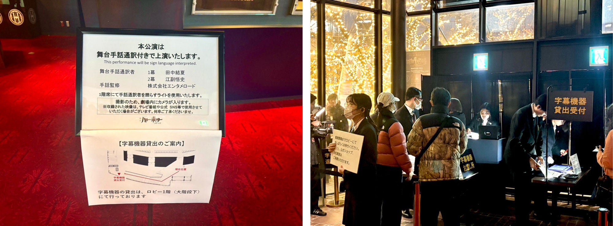 聴覚に障がいのあるお客様からは、「音声がわからなくても舞台を楽しめるなんて夢のような時間だった」「字幕だけでは伝えきれない豊かな表現力があることで、ろう者も一緒に舞台を楽しめる環境がありがたかった」「字幕機器を追っていると、どうしても舞台のセリフとタイミングがずれてしまう。でも、手話通訳があったおかげで、舞台で起きていることを他の観客と同じタイミングで理解できたし、魔法を見逃すこともなかった」などの感想が寄せられました。