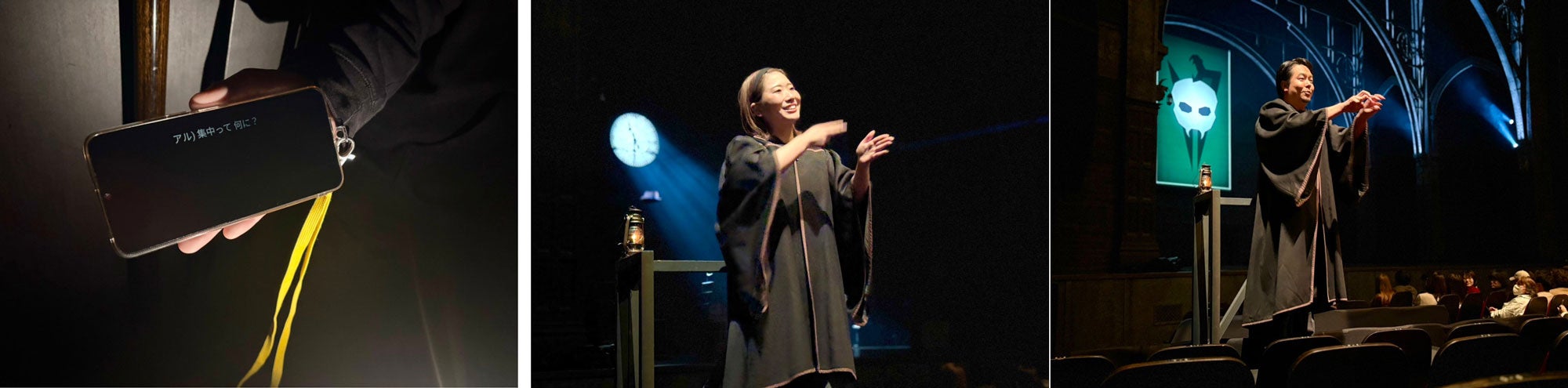 本番は、舞台向かって左側の客席エリアで、通訳者がグリフィンドールのローブ姿で舞台手話通訳を行いました。前回の舞台手話通訳付き公演の時よりも通訳者の位置を舞台に近づけることで、より舞台と手話通訳が同時に観やすくなり、作品の世界観を臨場感たっぷりに堪能していただくことができました。