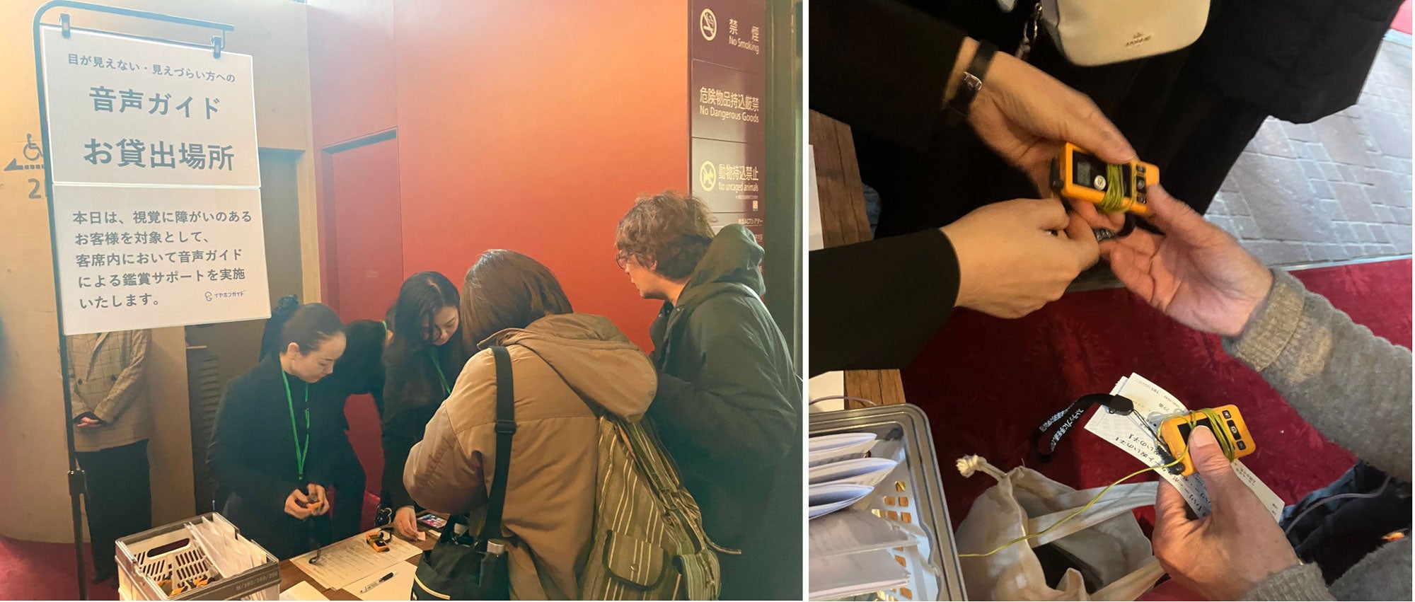 音声ガイド付き公演では、事前に視覚に障がいのある方のアテンドについて学んだスタッフが案内を担当。劇場内の移動のサポートも行いました。